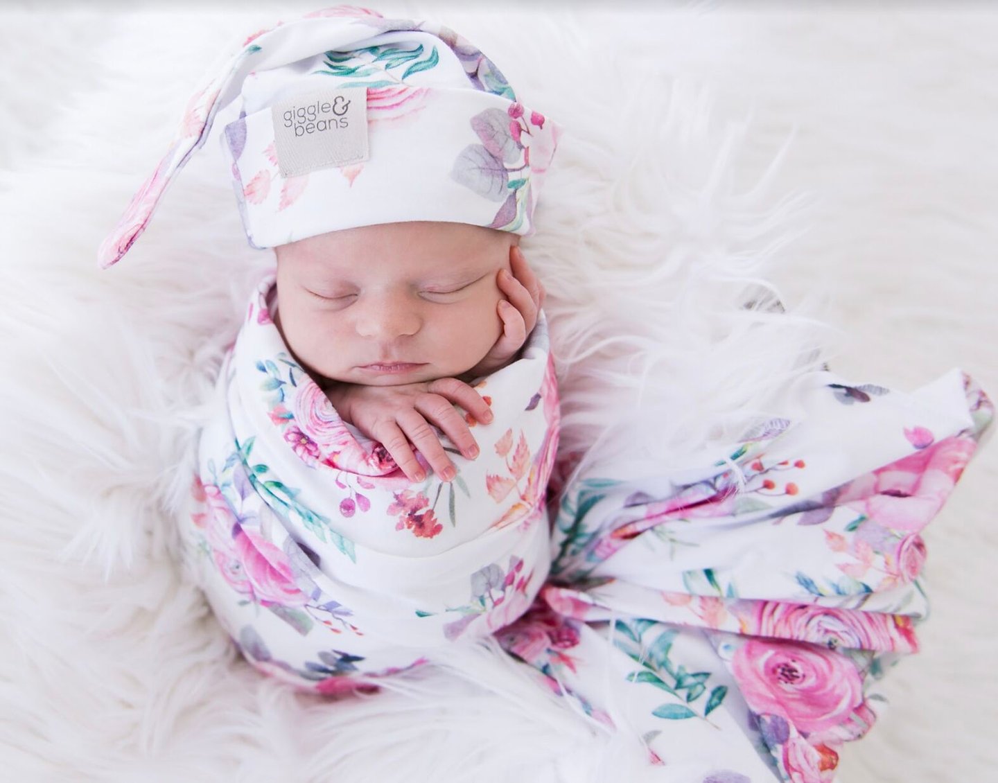 Peony Blooms Baby Swaddle Blanket Top Knot Beanie Set Giggle