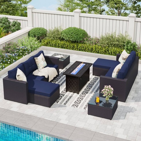 8pc Outdoor Steel Wicker Rectangular Fire Pit Set With Cushions