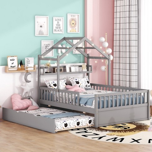 House bed frame clearance with trundle, Full Size Wooden House Bed With Twin Size Trundle And Shelf Gray clearance