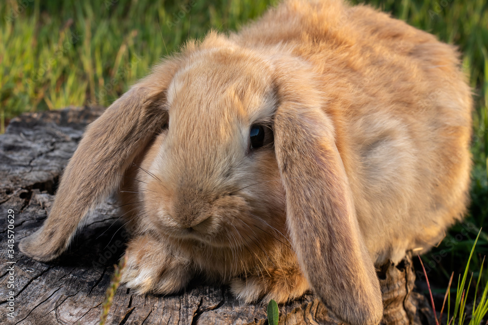 A French Lop rabbit sits on the green grass. Small fluffy brown