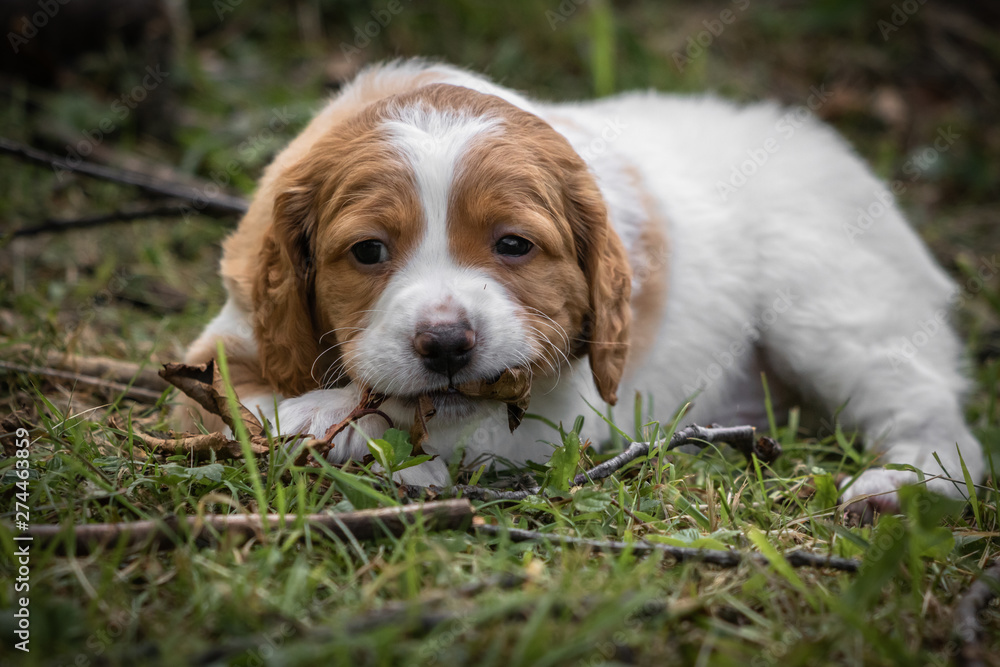 cute baby brittany spaniel dog with branch and leaves in his mouth