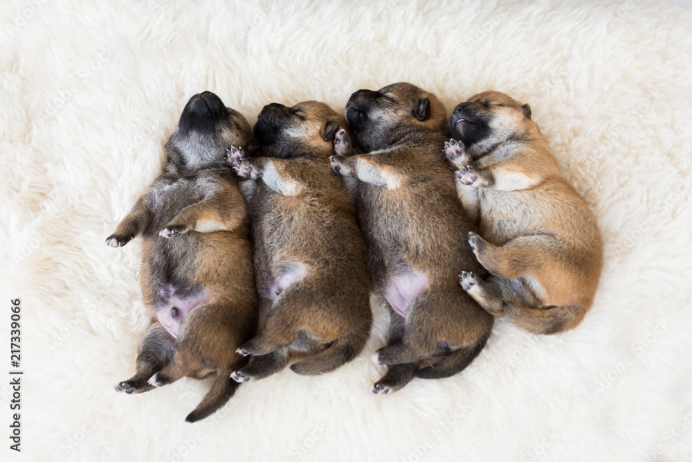 Close up portrait of fous cute newborn Shiba Inu puppies sleeping
