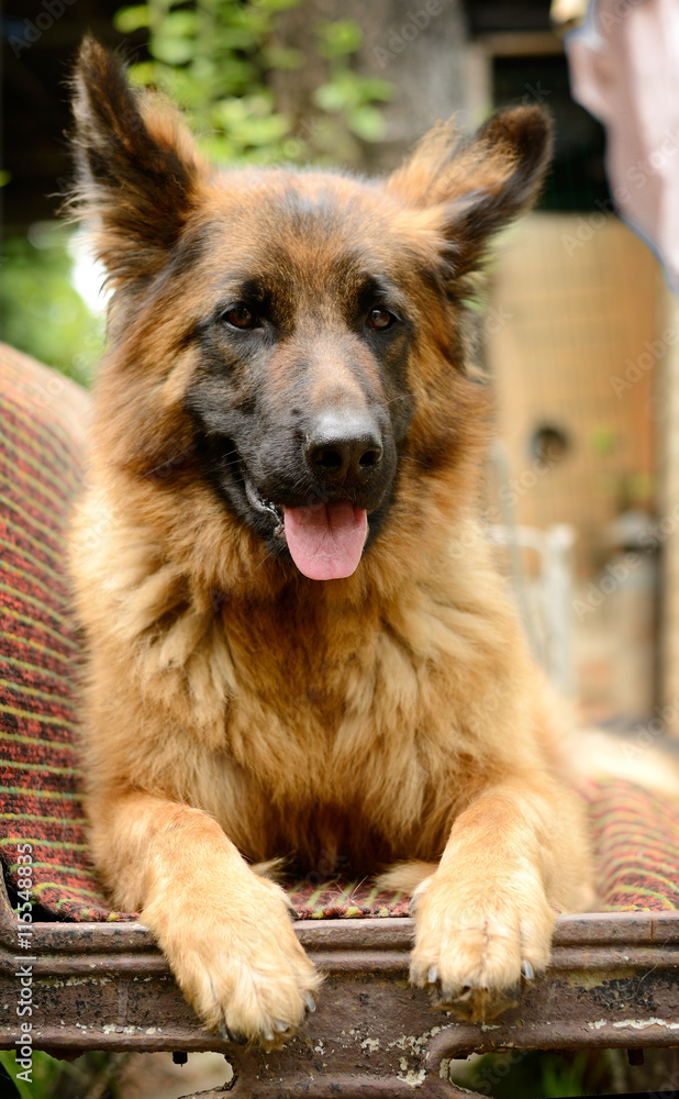Young Fluffy Dog Breed German Shepherd lying in the garden outdoor