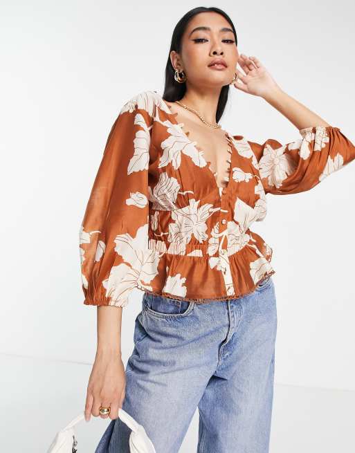 ASOS DESIGN elastic waist blouse with peplum hem button detail in tonal floral