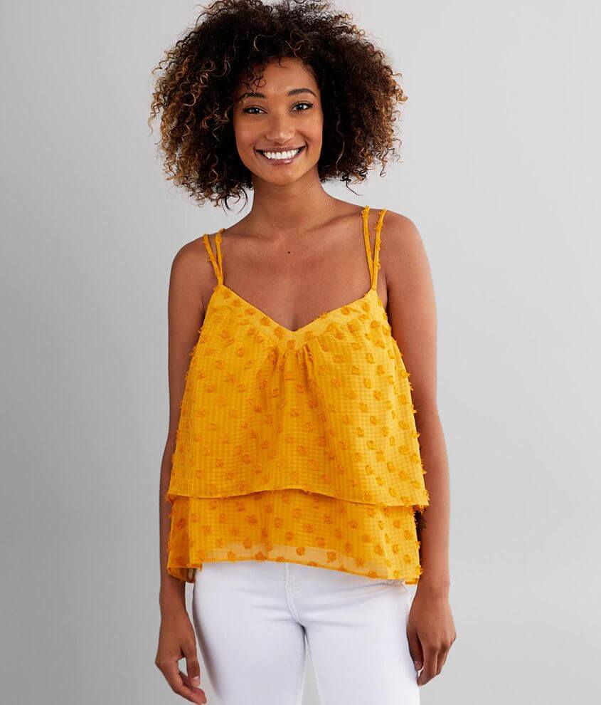 Chiffon clearance sleeveless top, Miss Me Swiss Dot Chiffon Tank Top Women s Tank Tops in Yellow clearance