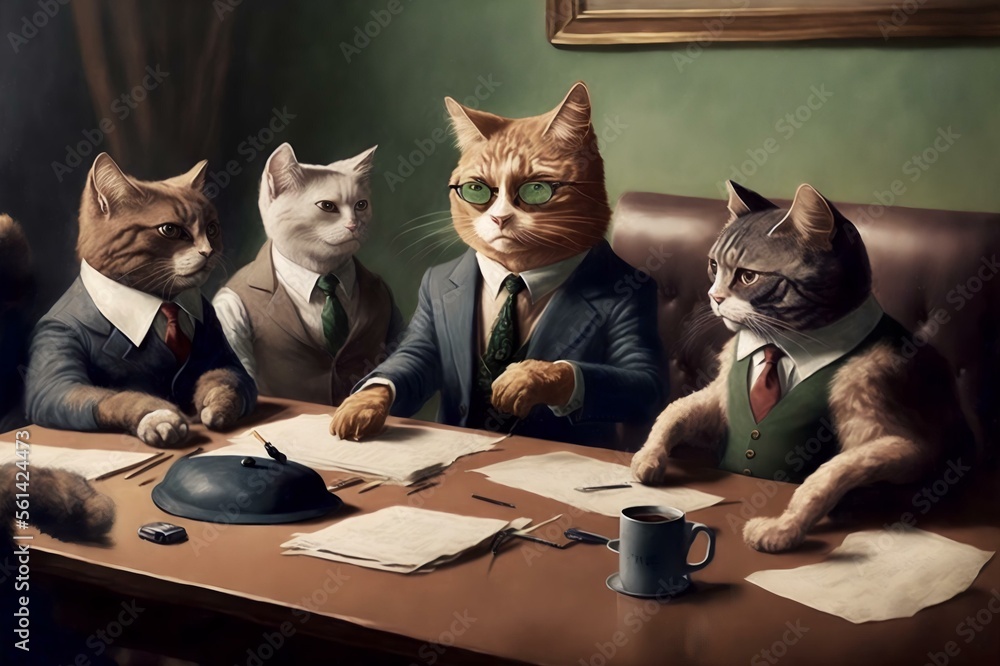 Cats meeting clearance, group of cats dressed in suits and ties gathered around a clearance