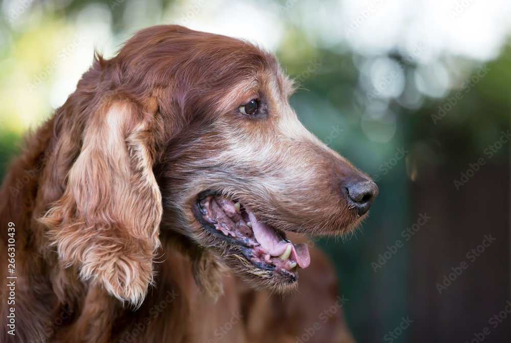 Face of an old beautiful Irish Setter pet dog as panting in summer