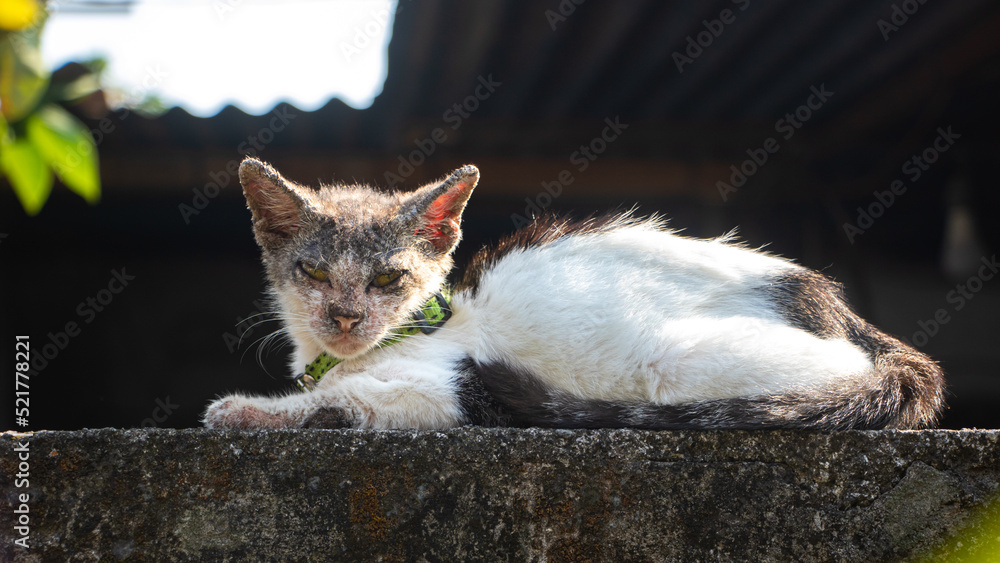 Cat with clinical sign of sarcoptic mange infection. Cat with skin