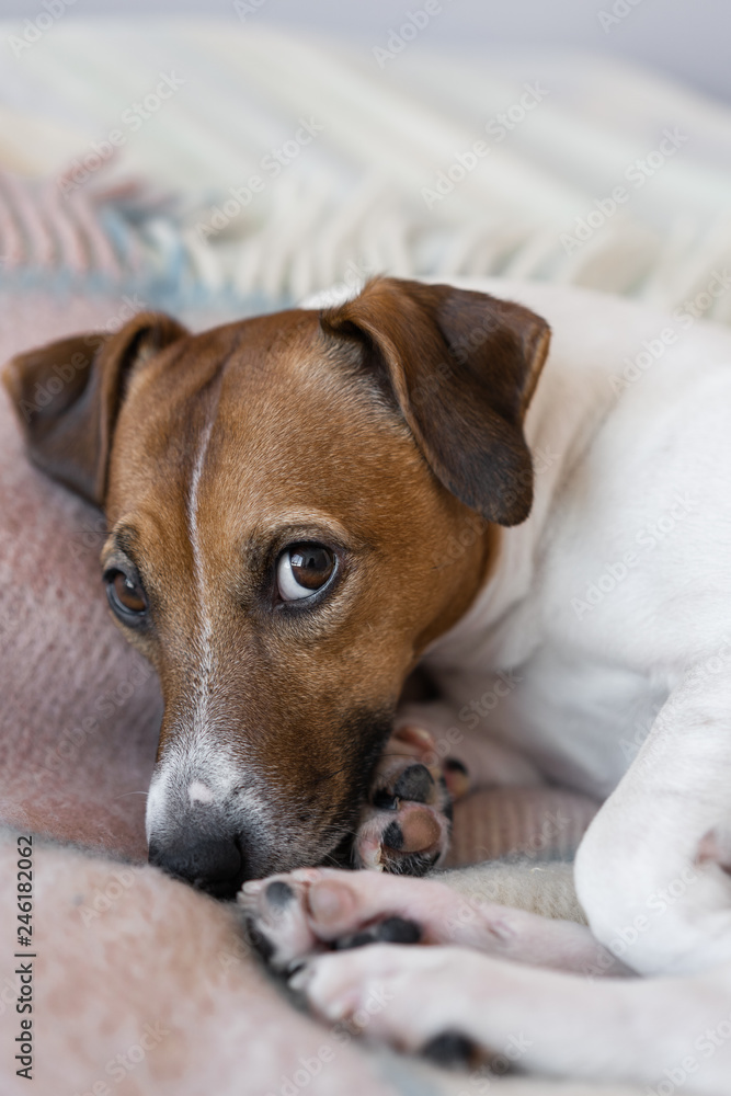 Close up of lying sick dog Jack Russell Terrier with sad eyes