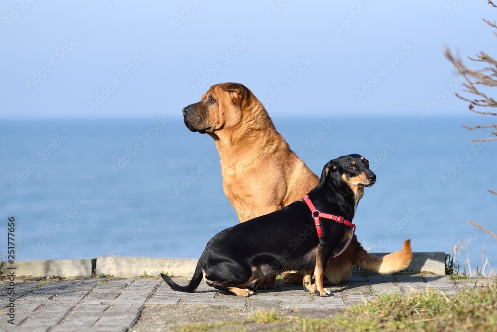 Two dogs red haired Shar Pei and a small black dachshund sit and