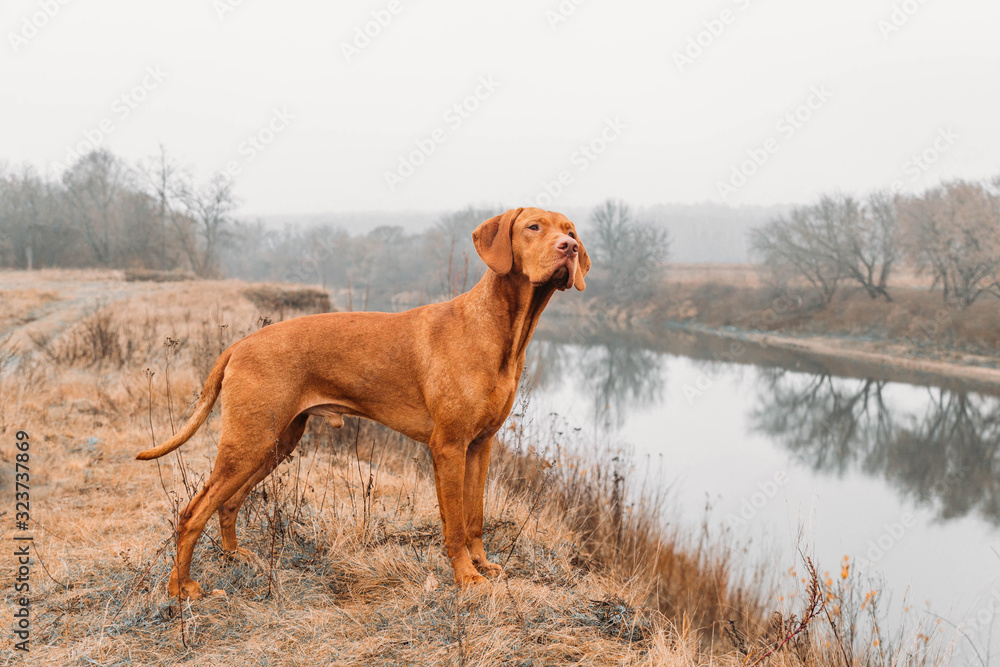 HUNTING hungarian vizsla DOG in the field on the hunt looks at the