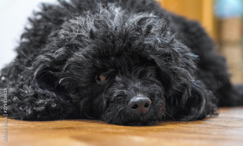 black fluffy dog of breed a poodle. Sad dog lying on the floor