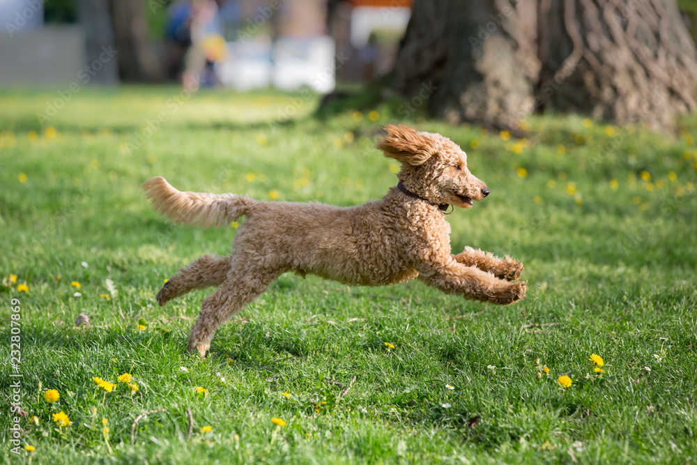 Young poodle running and jumping joyfully in a meadow. Apricot