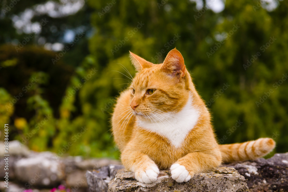 Nice portrait of a ginger or orange marmalade tabby cat enjoying