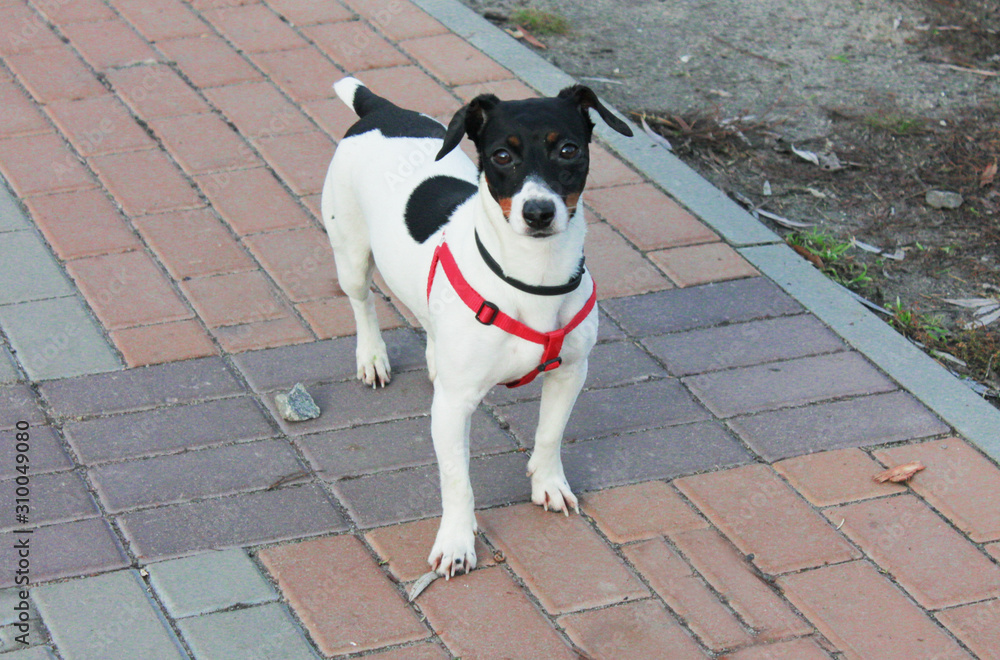 Cheerful dog Jack Russell Terrier white with black spots in a red