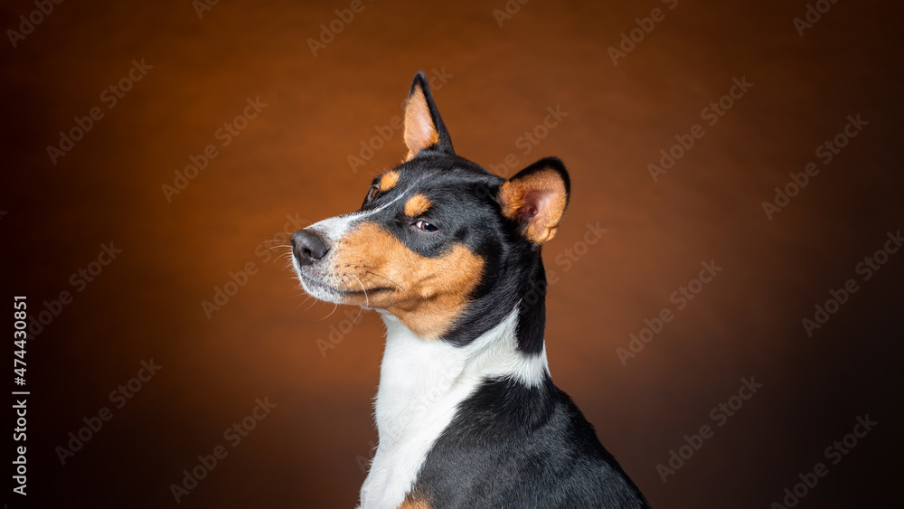 Basenji black and clearance tan, Portrait of african basenji breed dog against brown background clearance