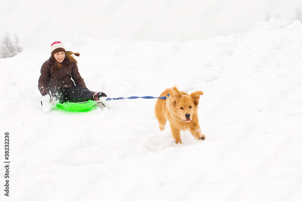 Golden Retriever Dog pulling a kid on a snow sled Stock