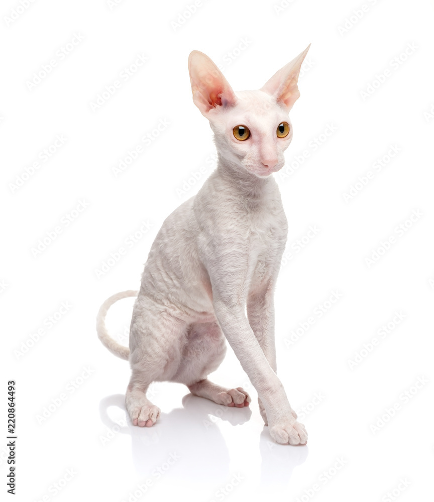 Thoroughbred White Cornish Rex Cat on White Background. Stock