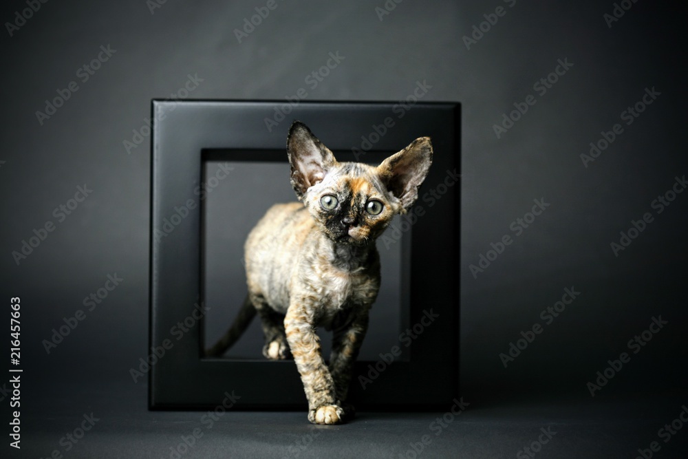 Tortoiseshell Devon Rex Walking Through Black Picture Frame Stock