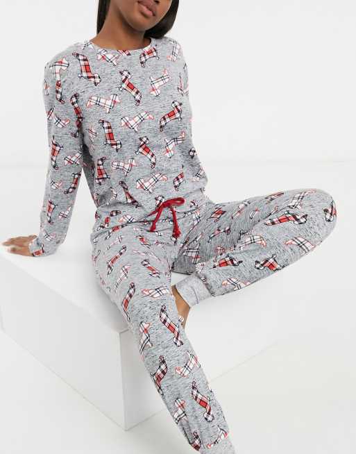 Chelsea Peers poly check print dachshund long pyjama set in grey NAVY