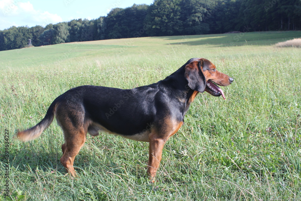 tyrolean hound after hunting in summer foto de Stock Adobe Stock
