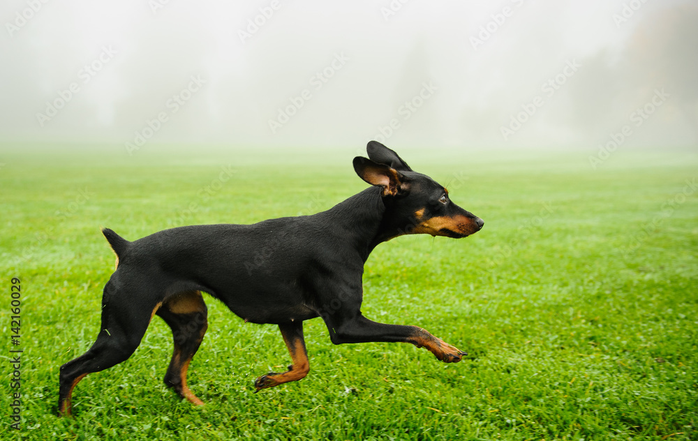 Miniature Pinscher running across grass lawn Stock Photo Adobe Stock