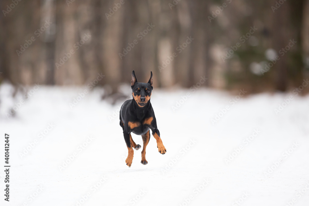 Miniature clearance pinscher running, Cute black dog breed miniature pinscher running on the snow path clearance