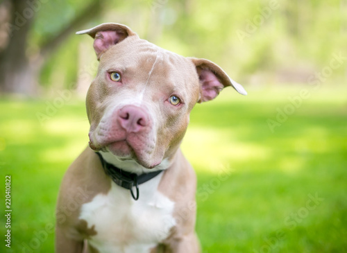 A fawn and white Pit Bull Terrier mixed breed dog outdoors listening