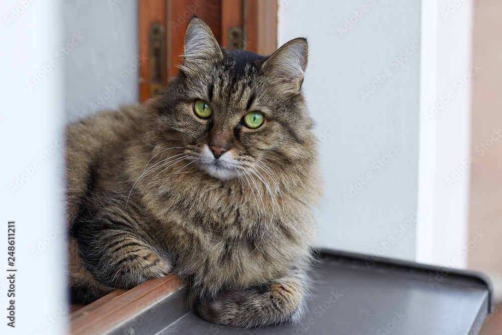 Long haired Siberian cat of tabby colour lais on the window sill