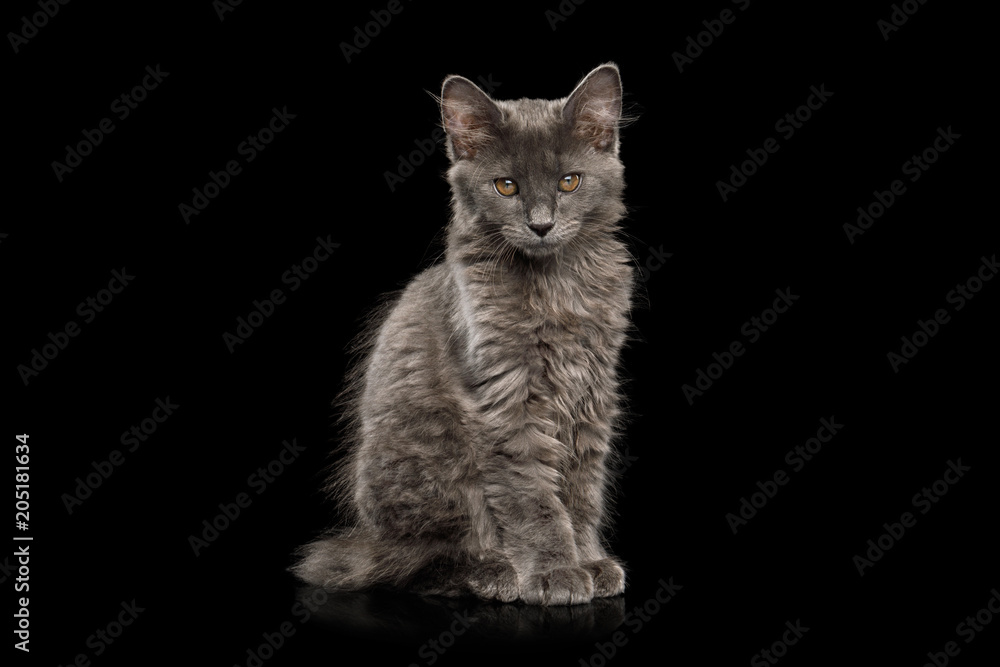 Cute Kurilian Bobtail Kitten with grey fur Sitting Isolated Black