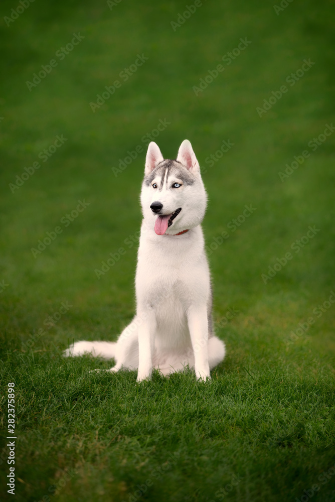 Husky with green clearance eyes, A young Siberian husky female dog sits on the green grass. She has clearance