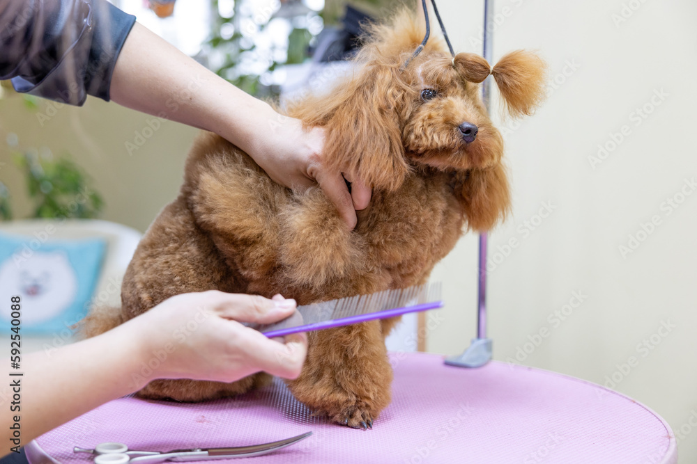 Groomer salon clearance, poodle hairstyle. The girl is combing the dog. Pet grooming clearance