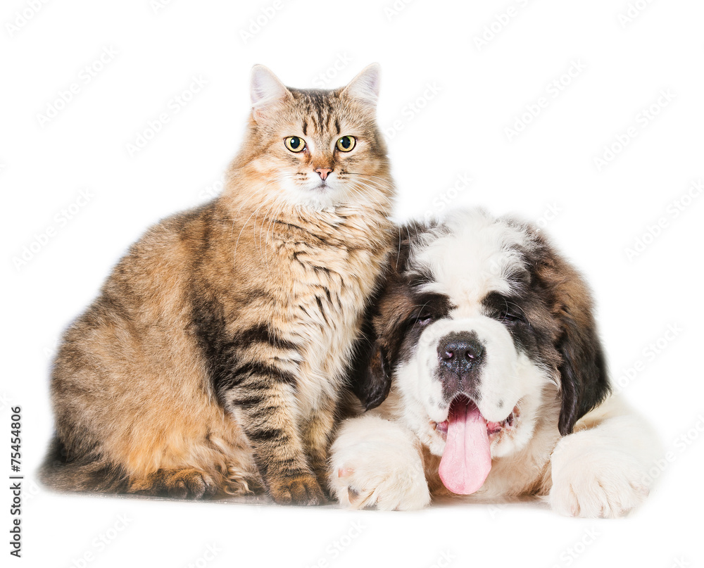 Saint bernard puppy with adult tabby cat Stock Photo Adobe Stock