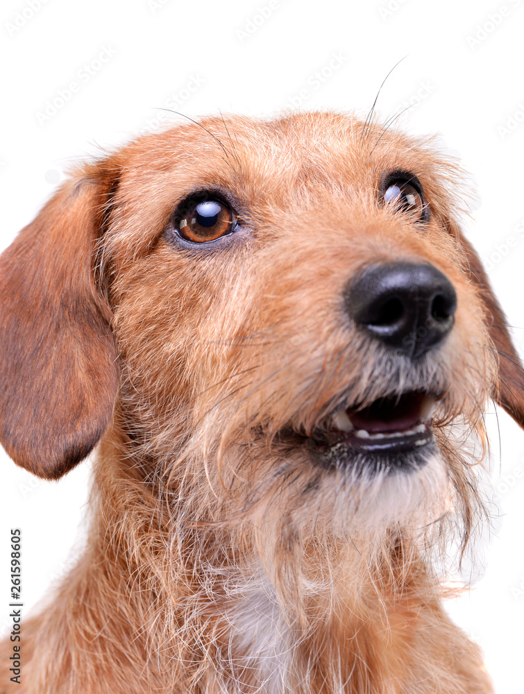 Portrait of an adorable wire haired dachshund mix dog looking up