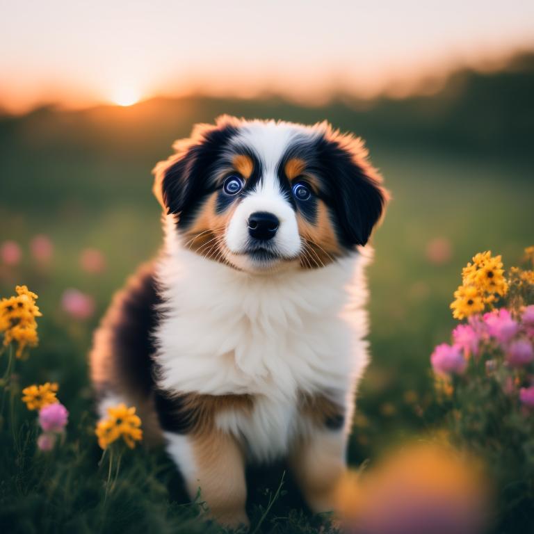 stale oryx403 cute Australian Shepherd puppy in a field of flowers
