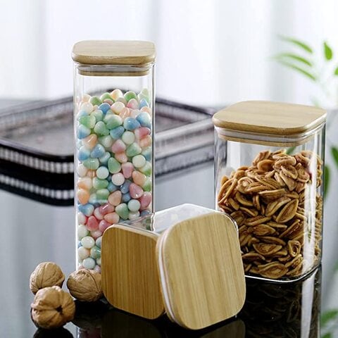 1CHASE Square Glass Storage Jar with Air tight Bamboo Lid Borosilicate Kitchen Food Storage Container Set for Candy Cookie Rice Sugar Flour Pasta