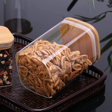 1 2pcs Square Glass Storage Jar Candy Jars With Lids Elegant Food Storage Container With Airtight Bamboo Wooden Lid Portable Transparent Food Canisters For Tea Coffee Bean Sugar Candy Cookie