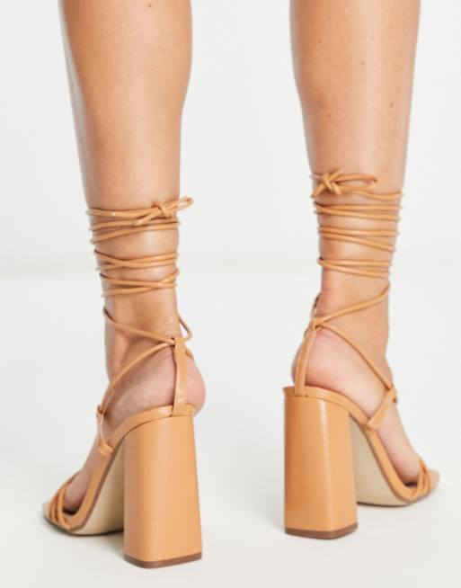 Tan wrap up clearance heels, Public Desire Viva Wide Fit Caramel Pu Square Toe Strappy Lace Up clearance
