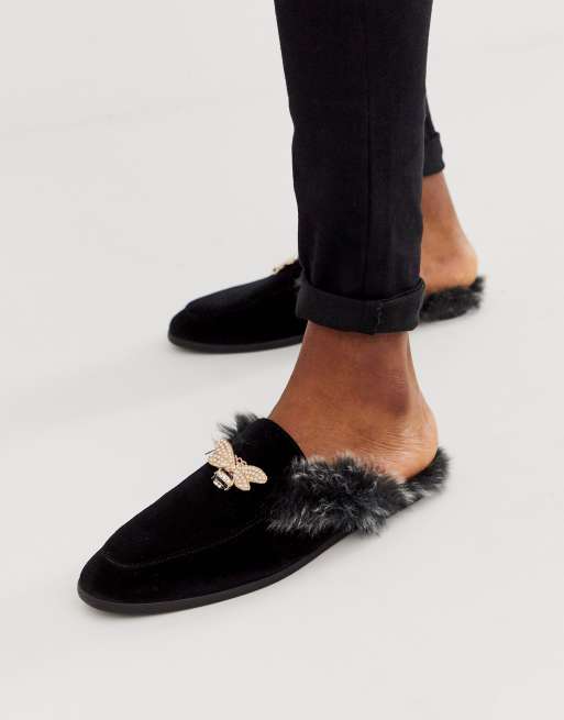 ASOS DESIGN backless mule loafer in black velvet with faux fur insock and hardware detail