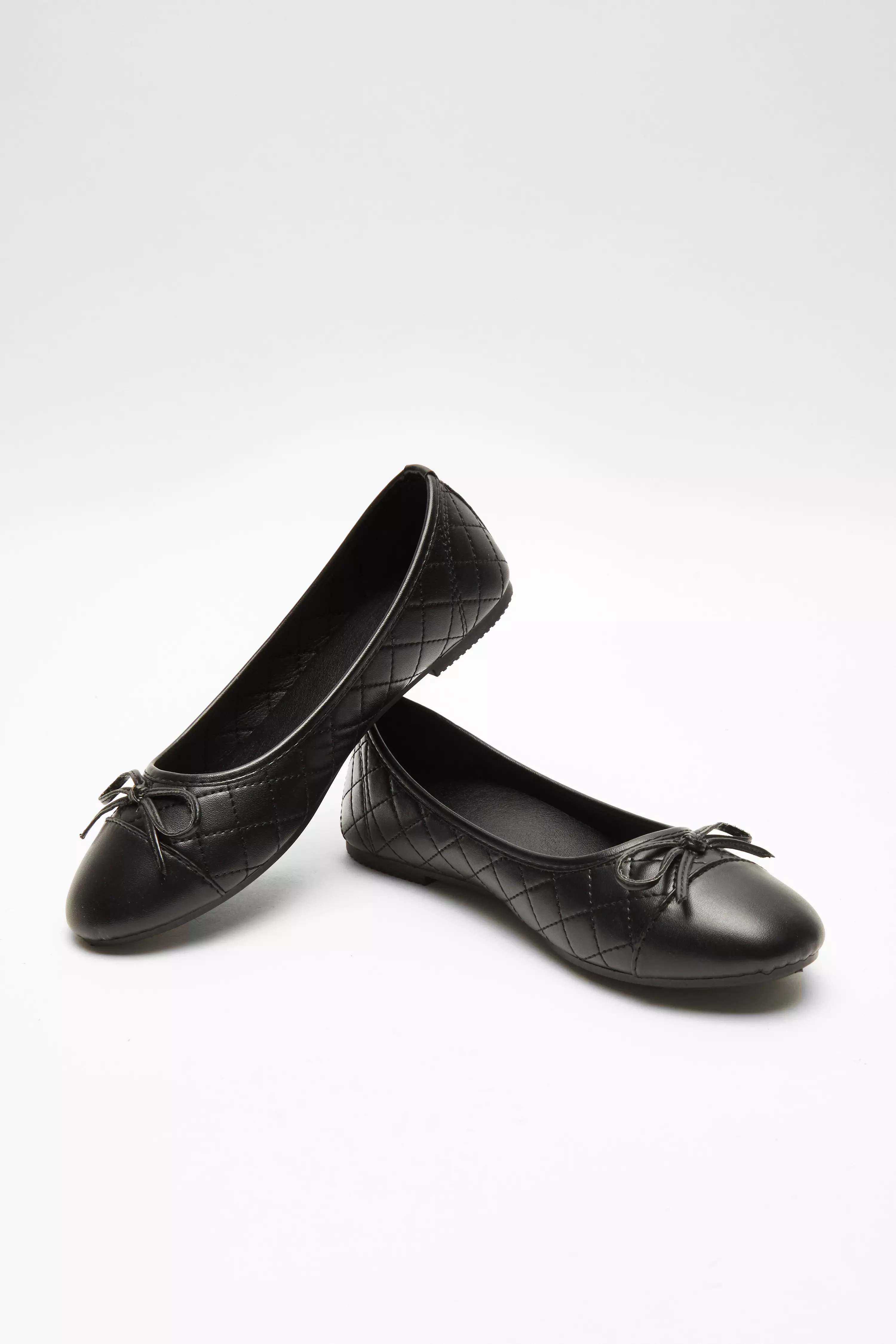 Wide Fit Black Quilted Leather Look Bow Ballerina Pumps
