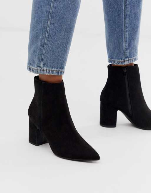PEACHES CHUNKY BLOCK HIGH HEEL ZIP UP ANKLE WINTER BOOTS IN BLACK FAUX SUEDE