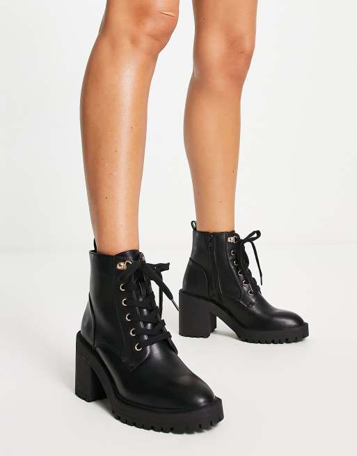 Ariel Chunky Lace up Block High Heel Zip up Biker Ankle Boots in Black Synthetic Leather
