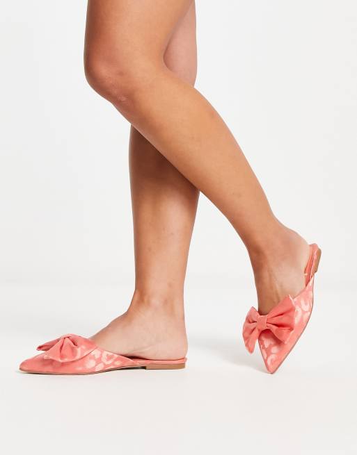 ASOS DESIGN Wide Fit Lass oversized bow pointed flat mules in coral satin