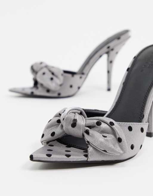 ASOS DESIGN Nester bow mules sandals on pointed insole in silver polka dot
