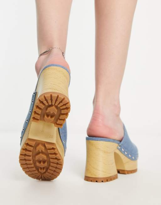 Block clearance heel clogs, Blue Tabitha Floral Denim Platform Clogs CHARLES KEITH UK clearance