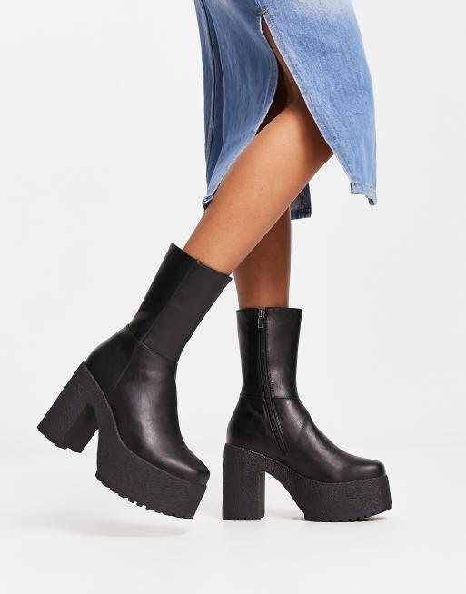 Ladies Women Black Chelsea Ankle Block High Heels Platform Chunky Boots Shoes