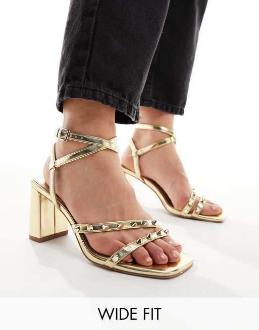 ASOS DESIGN Wide Fit Hampstead studded mid heeled sandals in gold