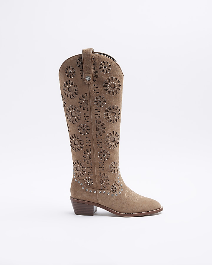 Ladies Curved Heel Beige Faux Suede Western Style Knee High Cut