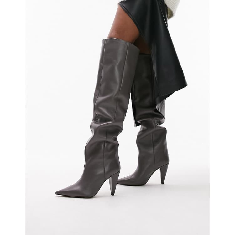 Topshop Tabitha premium leather cone heel knee high boot in grey