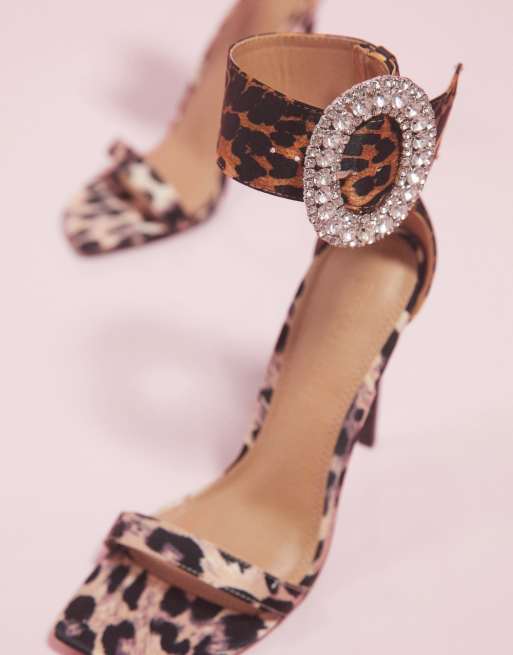 ASOS DESIGN Luxe Not cuff heeled sandals with diamante buckle in leopard